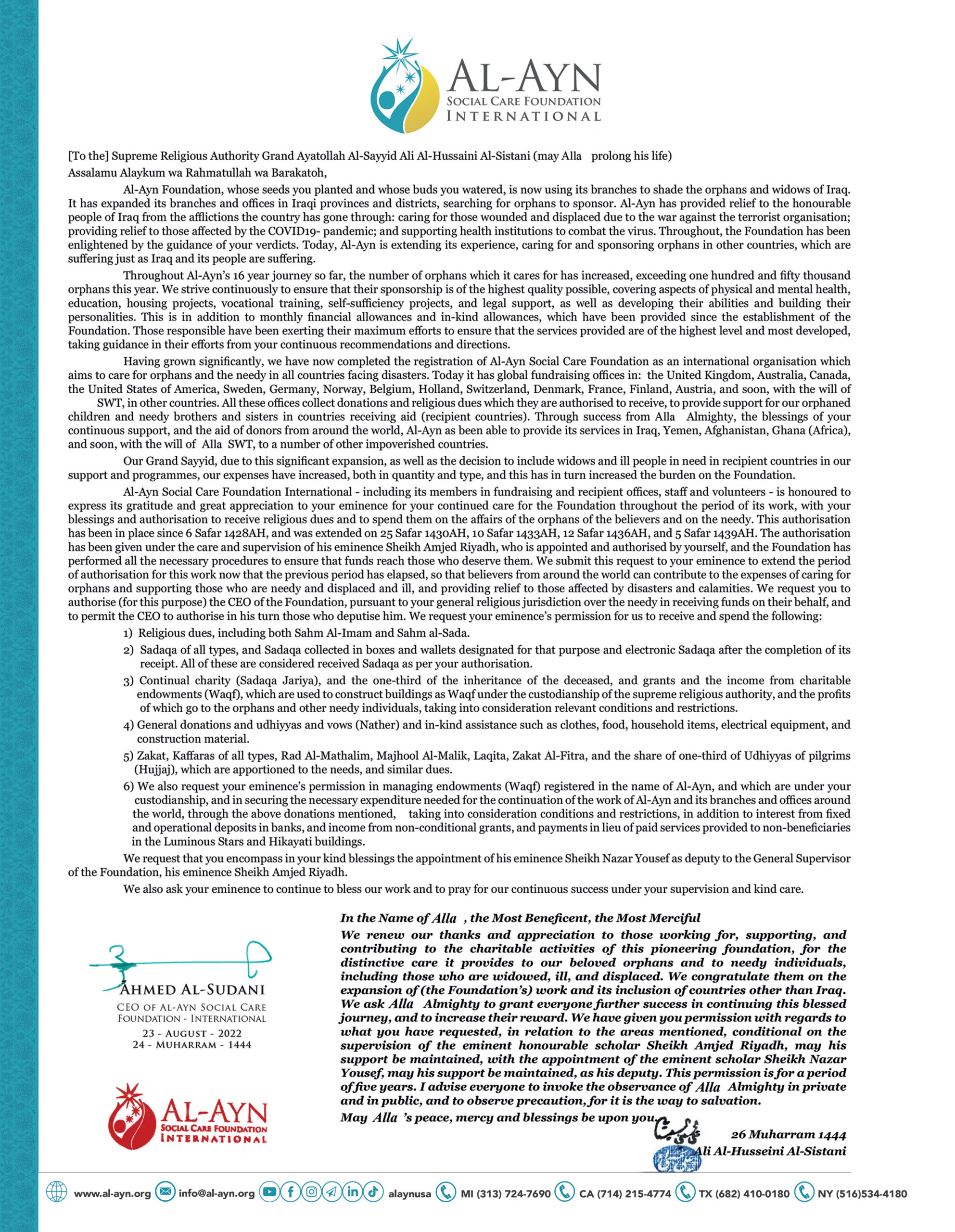 Al-Ayn er beæret over at have støtte fra Al-Sayyid Al-Sistani, som har givet os en ijaza (bemyndigelse) til at modtage religiøse bidrag såsom sadaqa, khums, fidya, kaffarah og zakat.