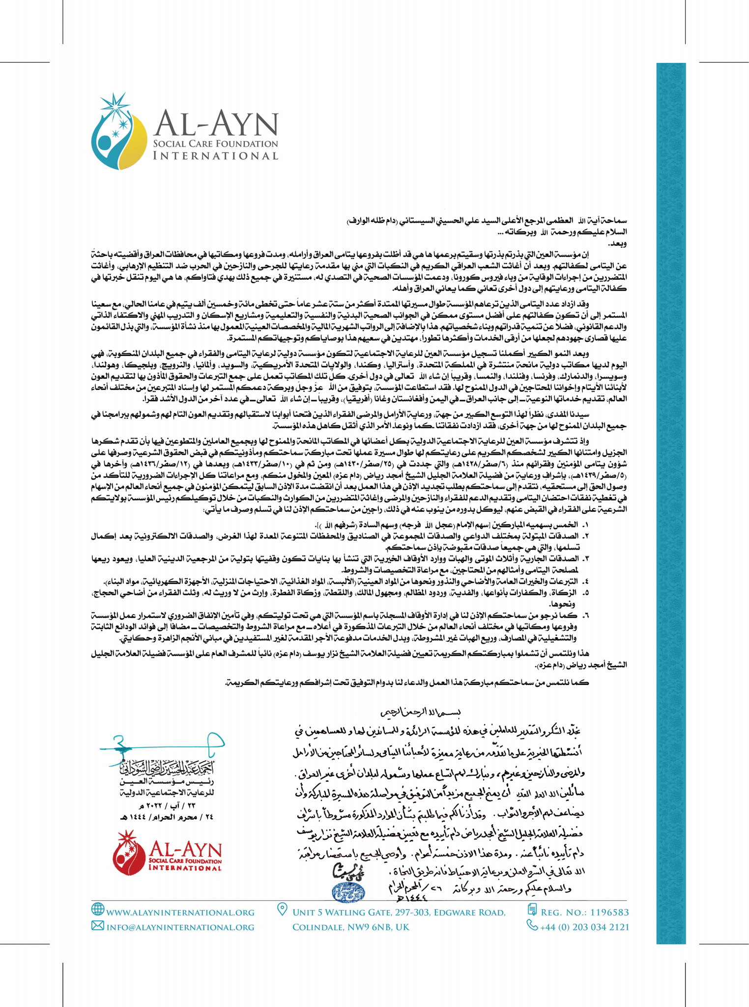 Al-Ayn har tjent forældreløse børn i to årtier med direkte støtte og velsignelse fra Hans Eminence Sayyid Al-Sistani. Hans tilladelse giver os mulighed for at modtage religiøse afgifter og donationer – en tillid, vi forpligter os til at opretholde.
